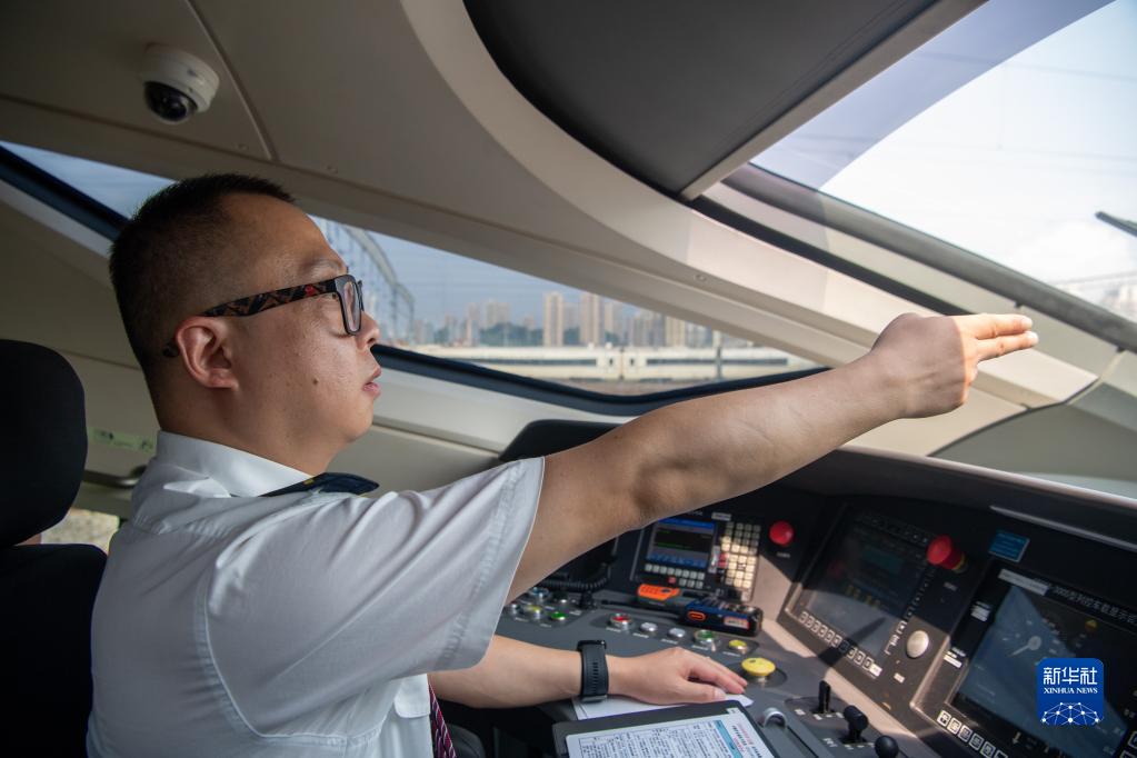 6月29日,在重慶西動車所,李治剛在駕駛室內(nèi)做發(fā)車前的準備工作。