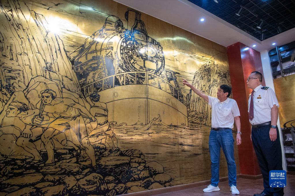 6月29日,在重慶機務段榮譽陳列室,李治剛(右)與父親李國方在一幅畫作前回憶爺爺李鴻升講述的成渝鐵路通車時的故事。