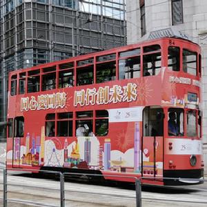 6月30日,涂裝慶祝香港回歸祖國25周年海報的電車在香港中環行駛。