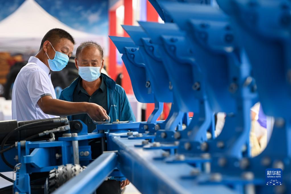 7月3日,在2022新疆農業機械博覽會上,工作人員為與會者介紹翻犁機。