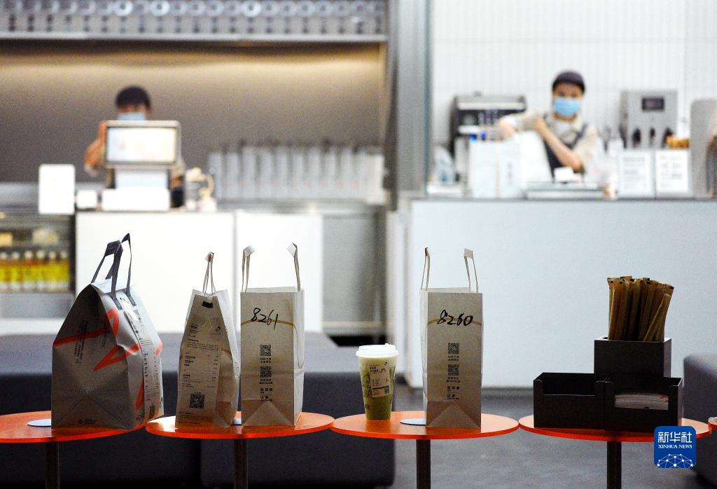 7月6日,在西安市未央區一家奶茶店內,餐品被放置在門口等待市民自提。