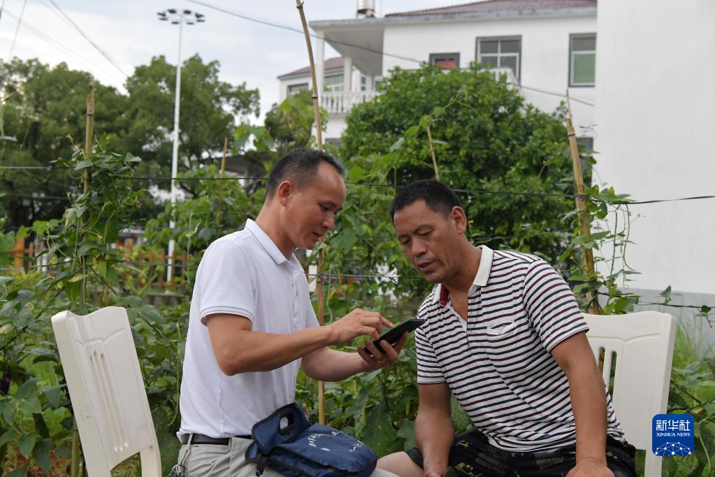 在江西省樂平市后港鎮磻溪村,程雪清在抗美援朝烈士王來松的侄兒王光亮家中向他介紹尋訪烈士墓地的過程,并將位于朝鮮開城的烈士墓地的照片給他看(7月6日攝)。