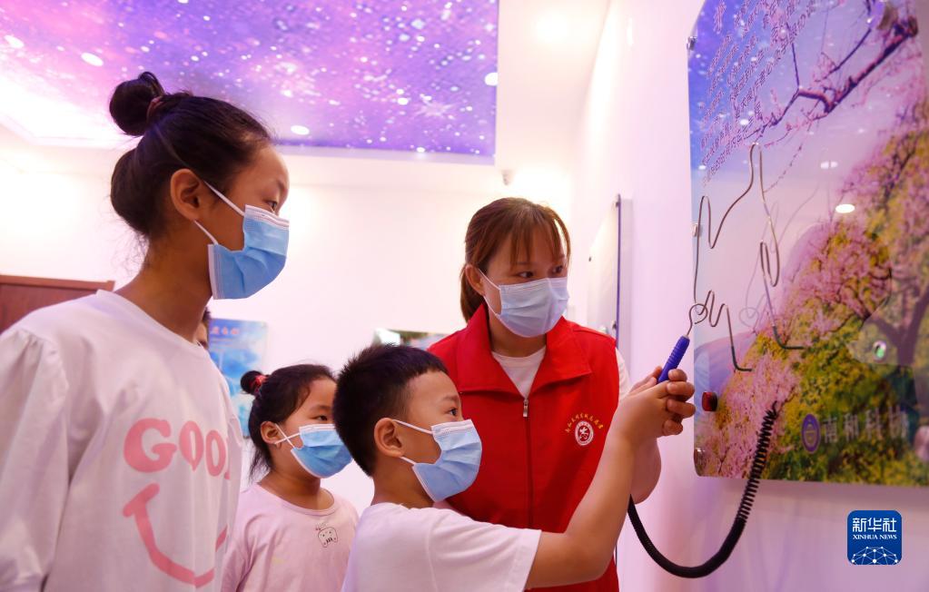 7月17日,在河北省邢臺市南和區和陽鎮和韻社區人文公共空間,文明實踐志愿者為孩子們講解科普知識。