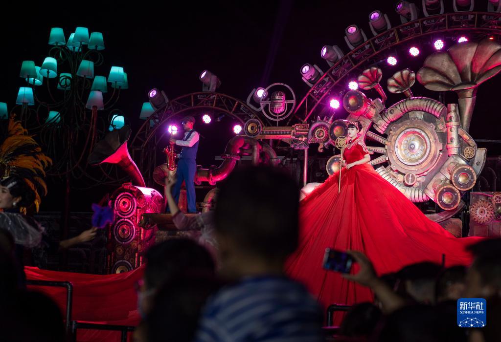 7月18日,游客在電影小鎮(zhèn)里觀看表演。