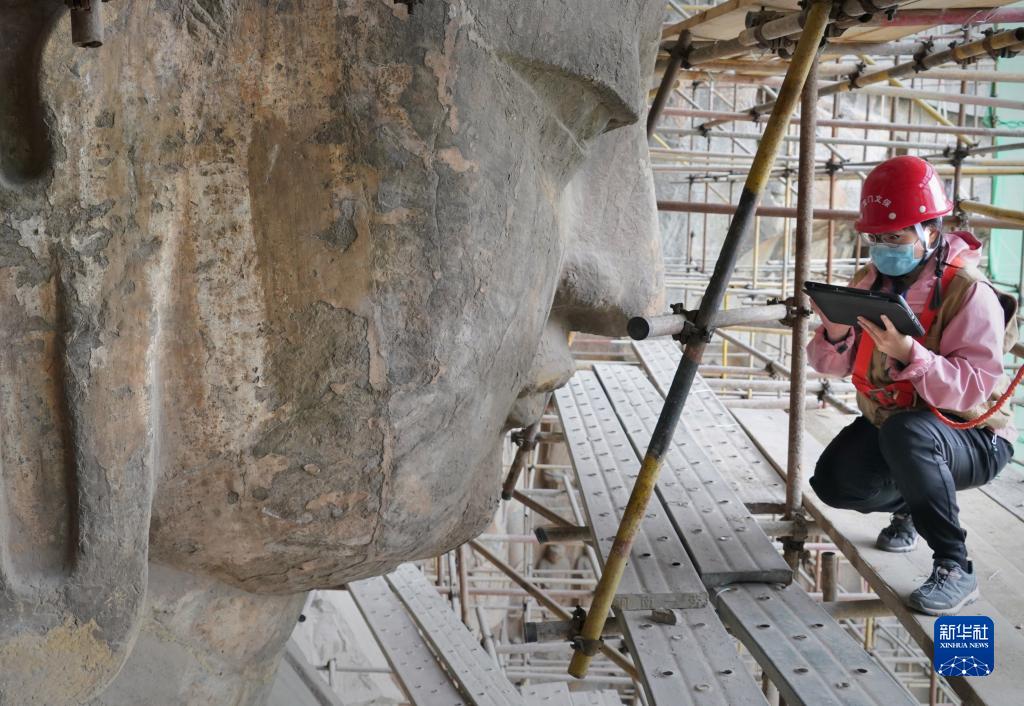 7月21日,固定在奉先寺崖壁上的腳手架及防護網開始有序拆除,洛陽龍門石窟奉先寺大型滲漏水治理和危巖體加固保護工程完工。滲漏水及危巖體一直是威脅龍門石窟文物安全的主要病害。2021年12月,龍門石窟奉先寺啟動大型保護工程,重點對這兩類病害進行修復治理,保障文物和游客安全。