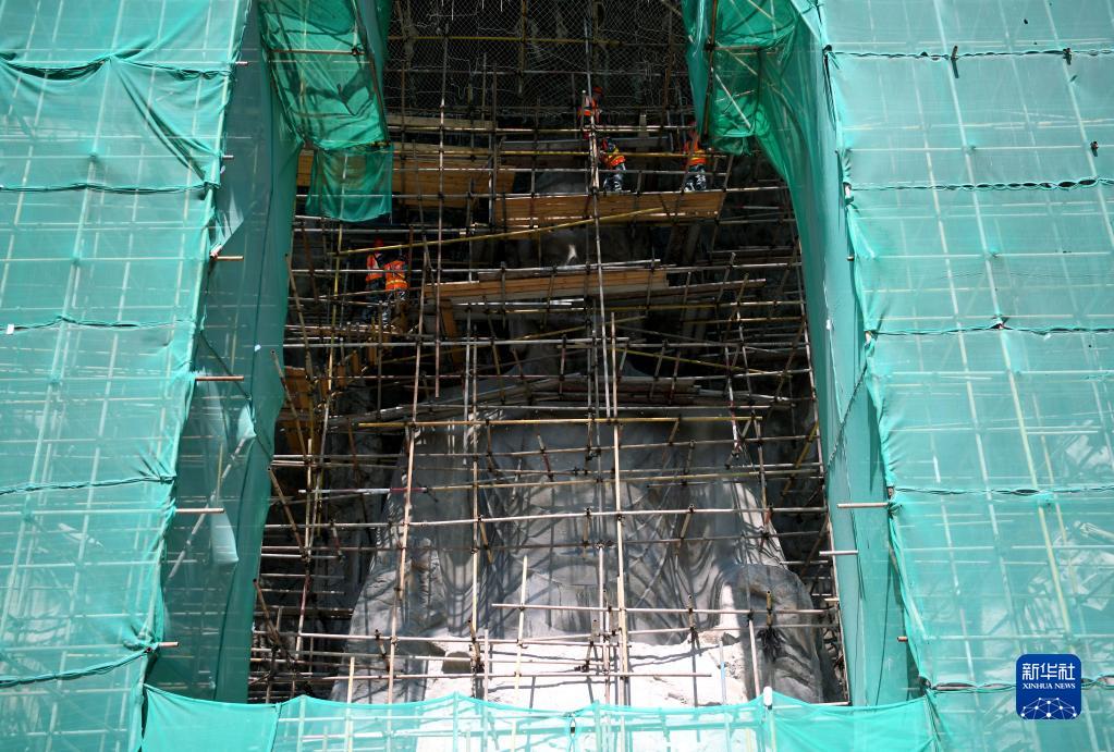 工作人員在洛陽龍門石窟奉先寺拆除腳手架(7月21日攝)。 新華社發(張怡熙 攝)