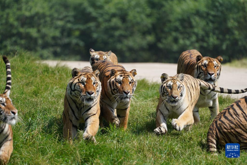 7月29日,東北虎在中國橫道河子貓科動物飼養繁育中心野化訓練區活動。