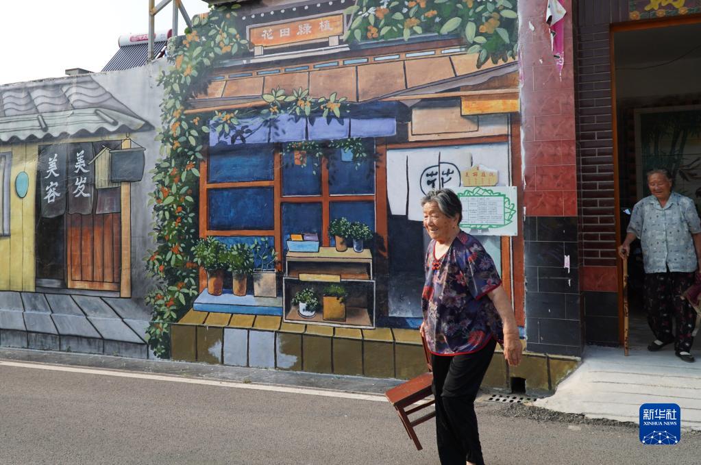 8月3日,北張村村民從墻繪藝術(shù)畫前經(jīng)過(guò)。