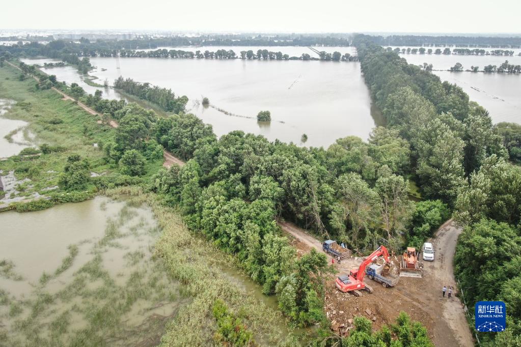 8月3日,參與搶險的工作人員使用大型機械設備運送搶險物料(無人機照片)。