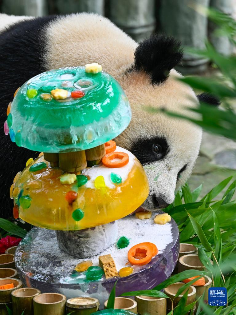 8月3日,在中國(guó)大熊貓保護(hù)研究中心雅安基地,大熊貓“安安”在享用美食。
