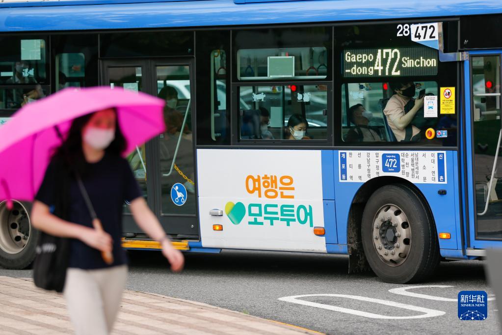 8月3日,在韓國首爾,乘客佩戴口罩乘坐公交車。
