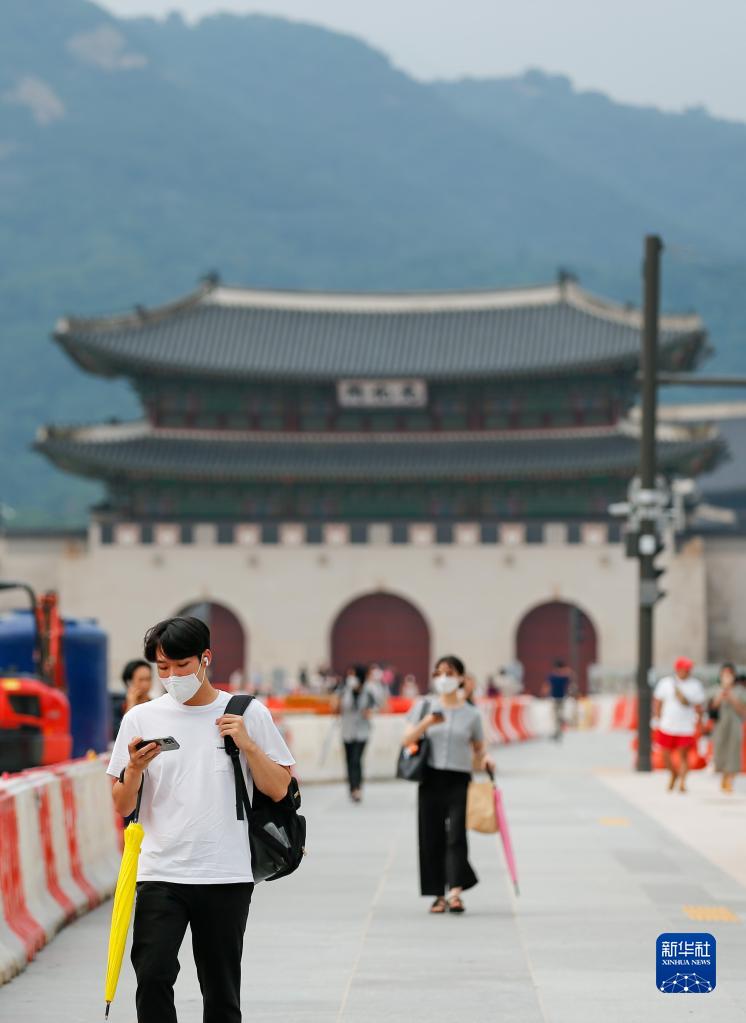 8月3日,行人佩戴口罩走在韓國(guó)首爾光化門廣場(chǎng)。