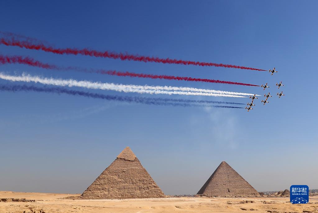 當日,埃及2022金字塔航空表演在吉薩金字塔景區舉行,來自埃及和韓國的多個飛行表演隊伍進行了多項精彩的飛行表演。