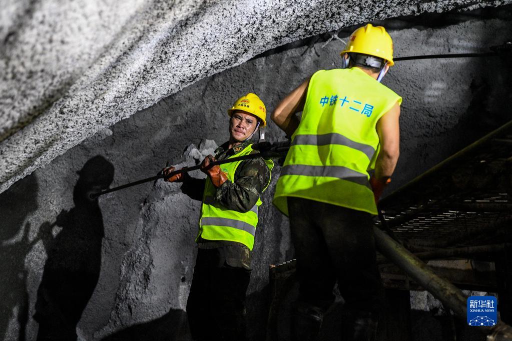 8月3日,在位于廣西環江毛南族自治縣的貴南高鐵大方山隧道內,工人用風槍打爆破眼。
