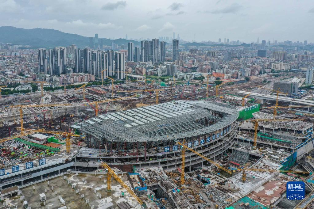 這是8月4日拍攝的建設中的廣州白云火車站(無人機照片)。