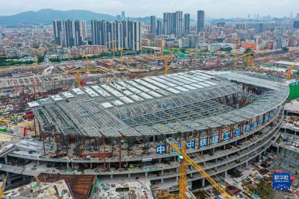 這是8月4日拍攝的建設中的廣州白云火車站(無人機照片)。