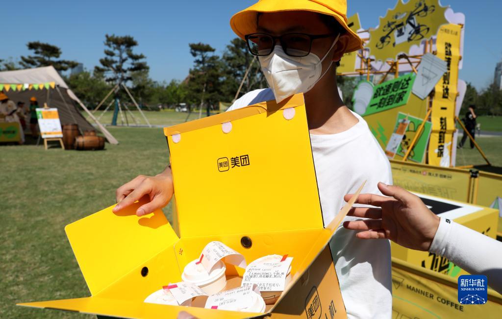 8月4日,工作人員在上海世博文化公園露營區展示無人機送來的咖啡。