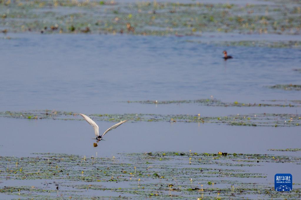 8月4日,候鳥在沉湖濕地水面上飛翔。