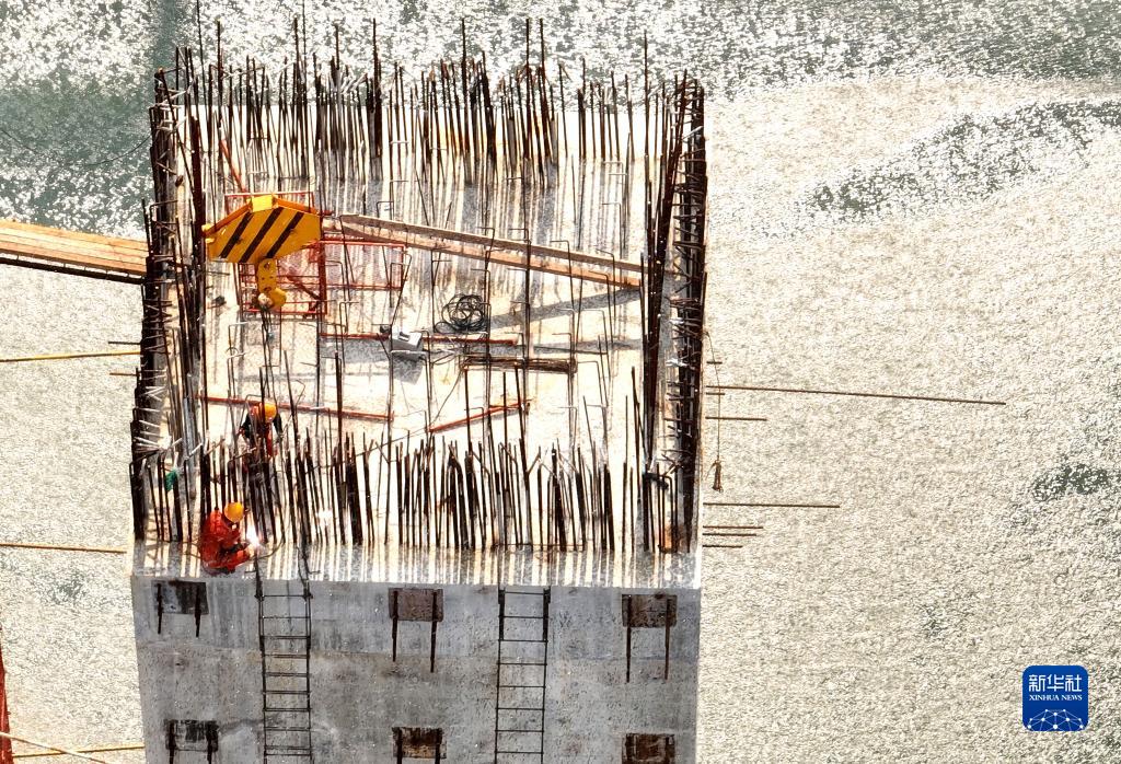 8月3日傍晚,融安至從江高速公路一期工程融水段,工人在橋墩上施工(無人機(jī)照片)。
