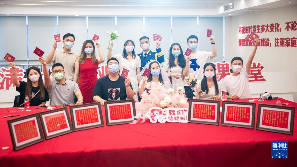 8月4日,在江蘇省南京市建鄴區(qū)民政局婚姻登記處,新人們在參加完手寫婚書活動后合影留念。