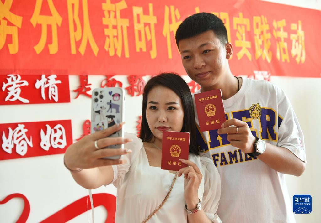 8月4日,在河北省石家莊市欒城區(qū)民政局婚姻登記處,一對新人領(lǐng)取結(jié)婚證后拍照留念。