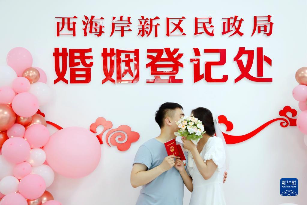 8月4日,在山東省青島市西海岸新區(qū)民政局婚姻登記處,一對新人領(lǐng)取結(jié)婚證后拍照留念。