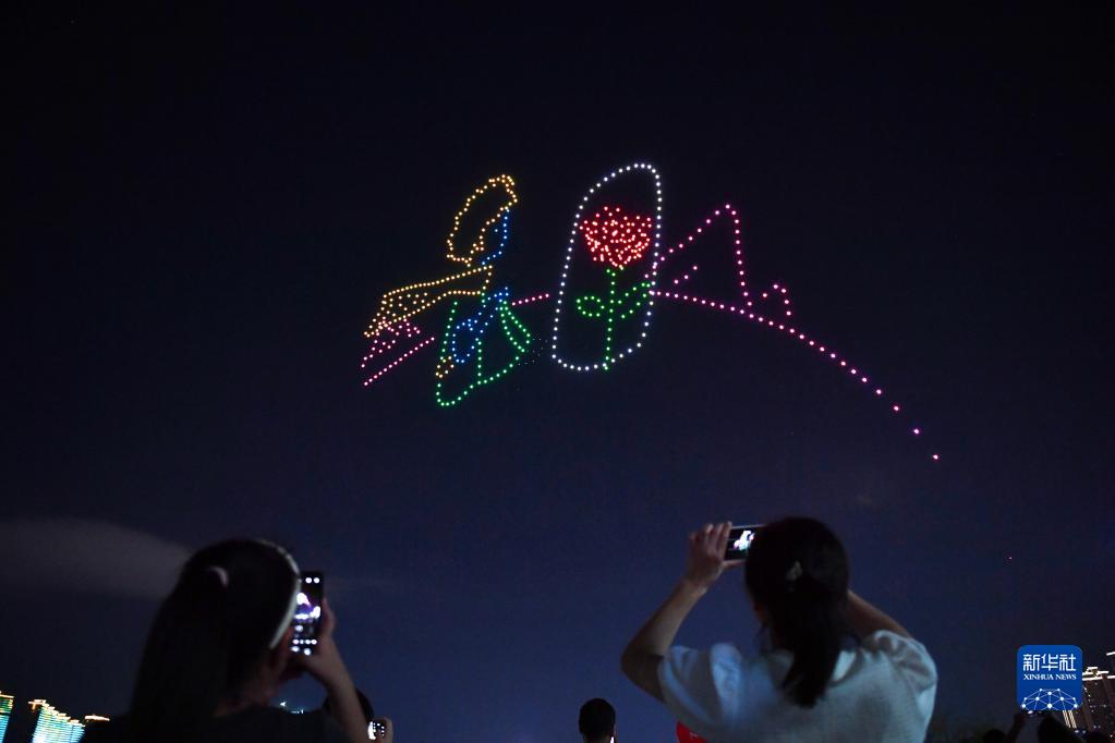 當日是七夕節(jié),一場無人機光影秀在湖南省長沙市湘江畔上演,吸引市民駐足觀看。