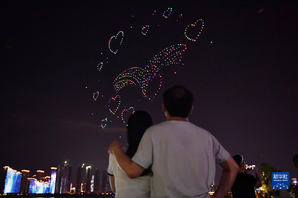 當(dāng)日是七夕節(jié),一場(chǎng)無(wú)人機(jī)光影秀在湖南省長(zhǎng)沙市湘江畔上演,吸引市民駐足觀看。