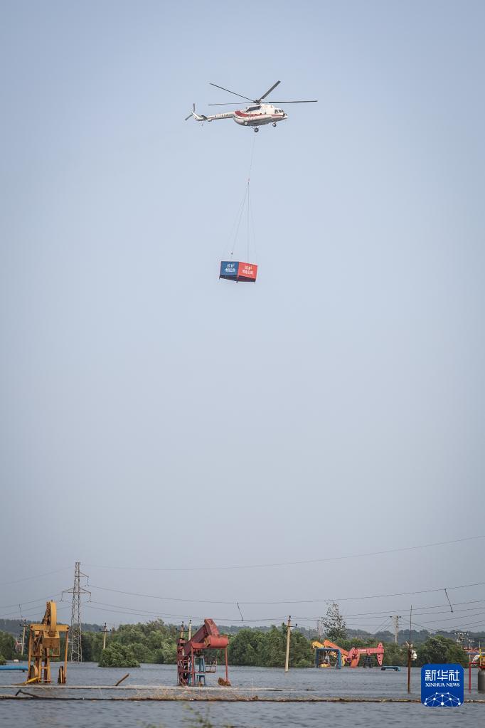 8月4日,直升機吊裝六角沉箱前往潰口處。