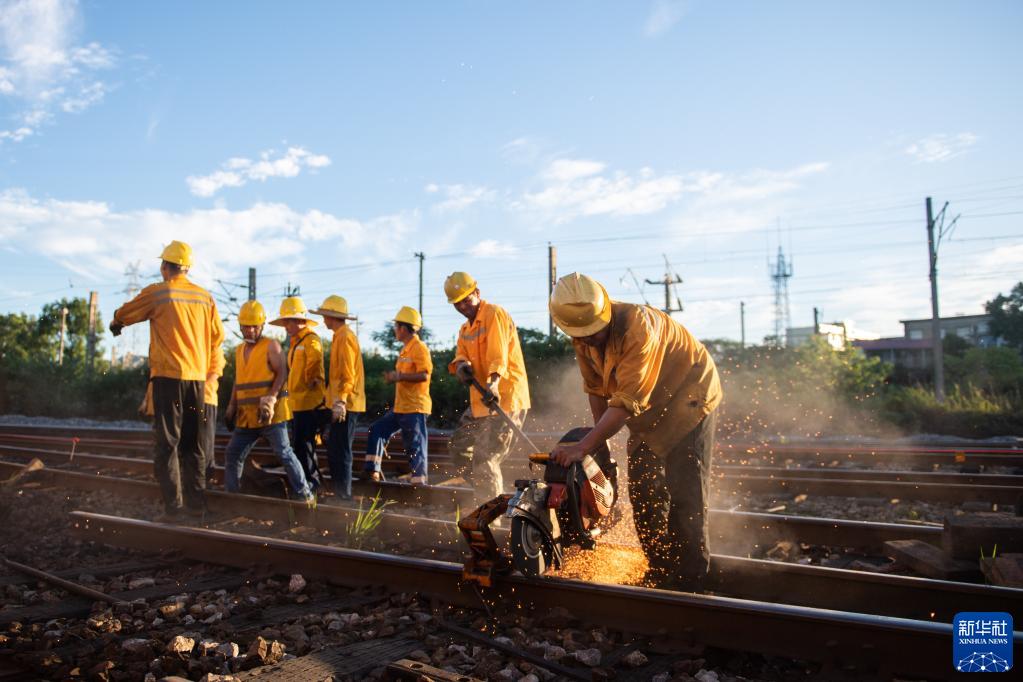 8月5日,在株洲北站編組場,鐵路工人正在鋸軌。