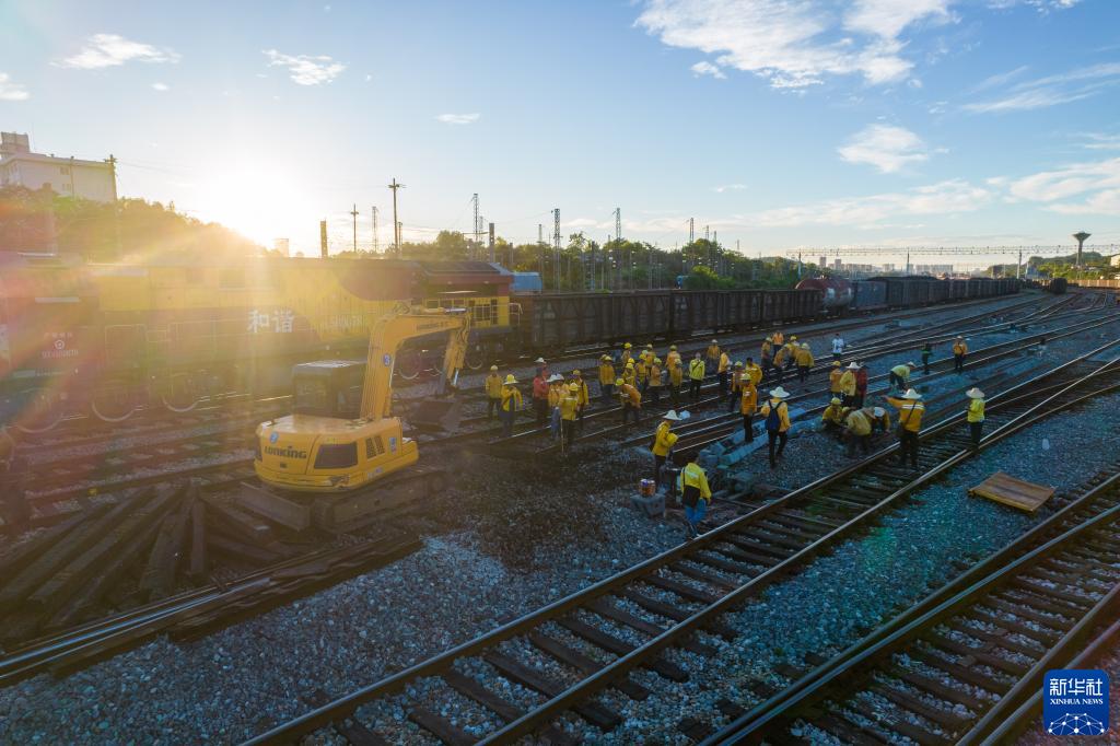 8月5日,在株洲北站編組場,鐵路工人們正在換岔施工(無人機照片)。