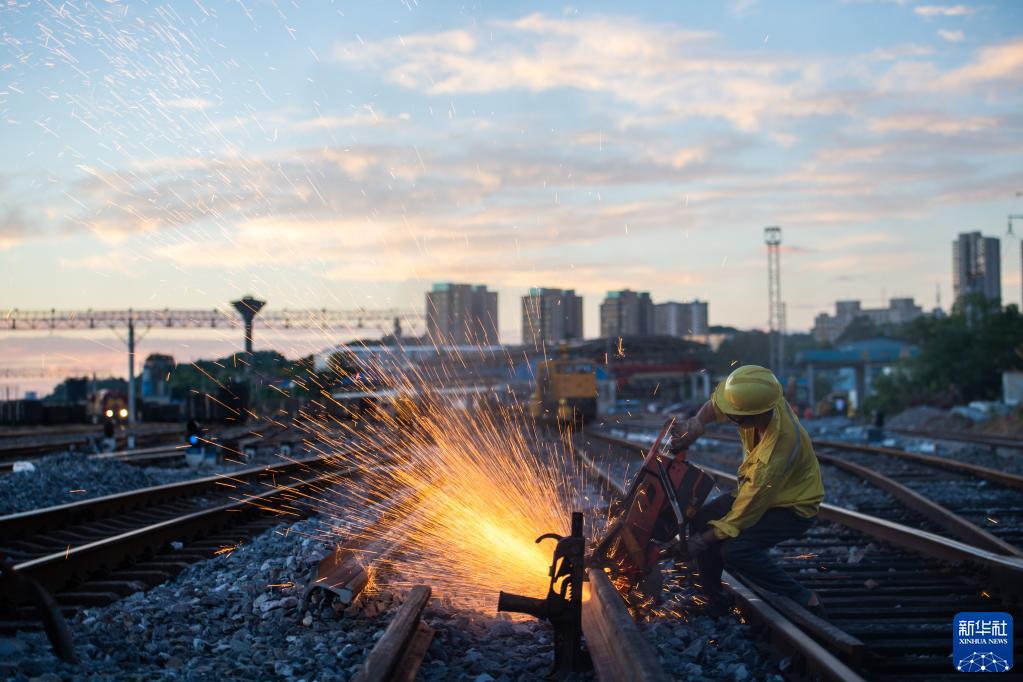 8月5日,在株洲北站編組場,鐵路工人正在鋸軌。