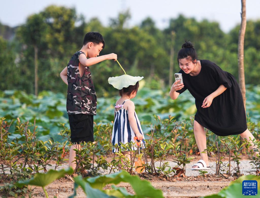8月4日,游客在河南省南陽市淅川縣九重鎮鄒莊村游玩拍照。