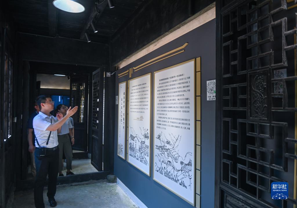 8月5日,黨員志愿者(前)為參觀者介紹“文瀾閣《四庫全書》抗戰(zhàn)西遷首站研學(xué)中心”。