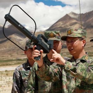 西部戰區聯合參謀部某局處長王道彬(左)組織車載監測設備訓練(2022年7月14日攝)。
