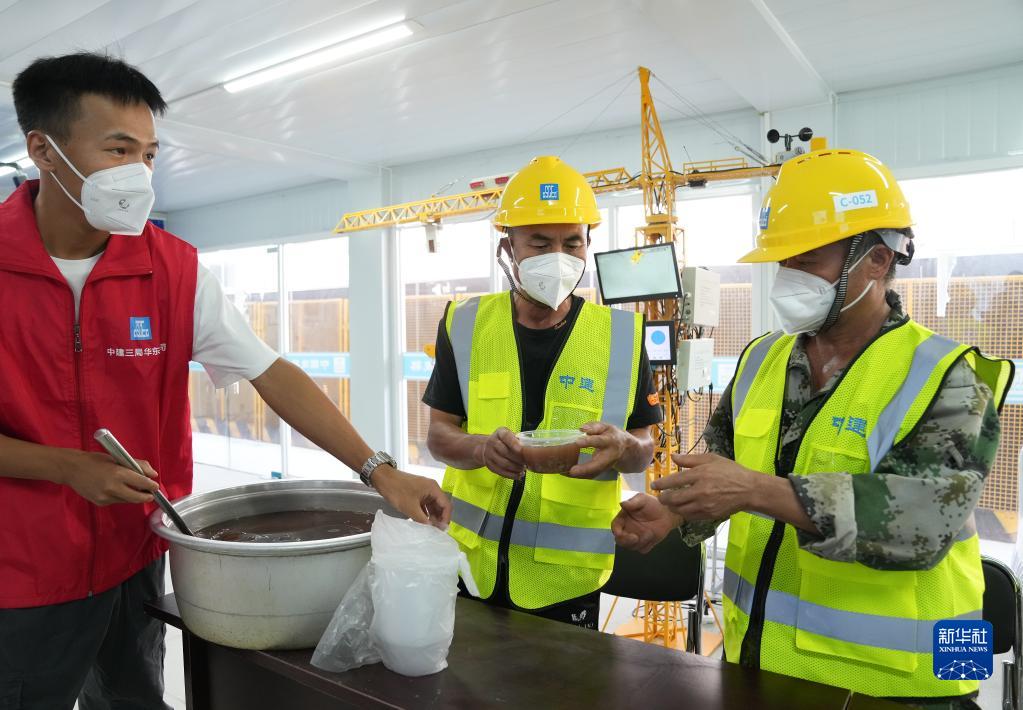 8月5日,在位于上海的一項目工地工友服務點,中建三局華東公司上海分公司的工人在領取綠豆湯。