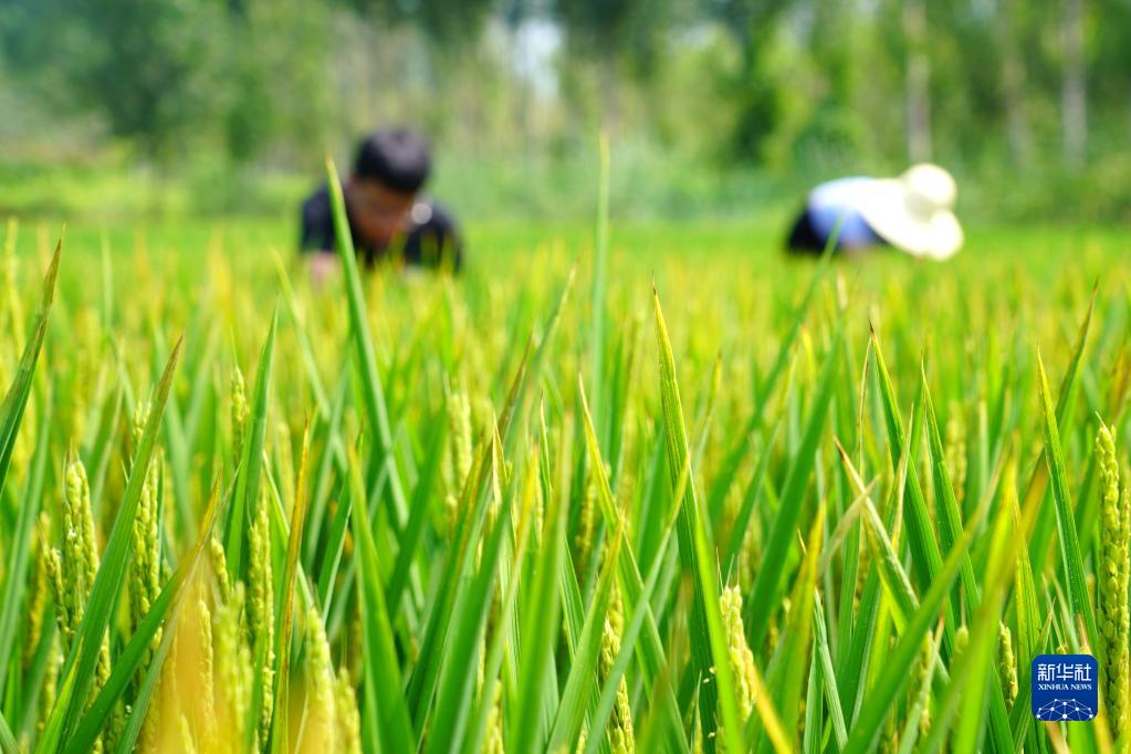8月5日,河北省唐山市豐南區岔河鎮楊義口頭村的農民在水稻田間勞作。