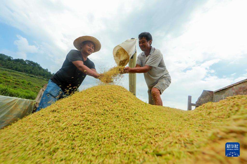8月5日,村民在貴州省黔東南苗族侗族自治州岑鞏縣水尾鎮新場村收割制種水稻。