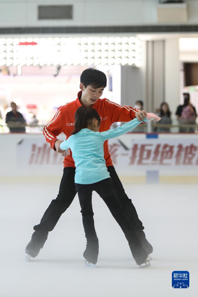 8月4日,在遼寧省沈陽市冰紛萬象冰場,一名小朋友在教練的指導下學習花樣滑冰。