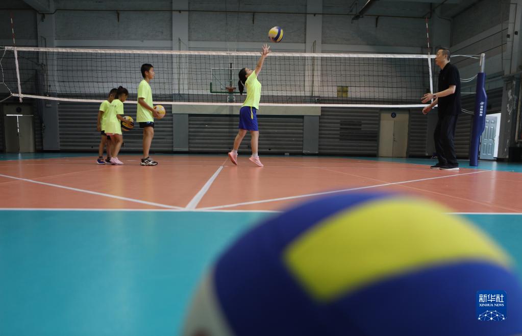 8月5日,在遼寧省沈陽(yáng)市沈陽(yáng)體育學(xué)院開(kāi)展的暑期夏令營(yíng),小朋友們?cè)诰毩?xí)排球。