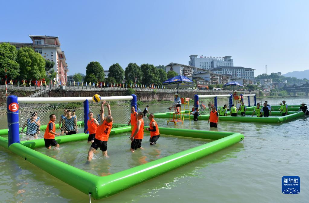 近日,湖北省宣恩縣在當地仙山貢水旅游區的貢水河上舉行水上運動會。別具一格的“水上排球”項目吸引了眾多市民和游客參加比賽,享受水上趣味運動帶來的歡樂。