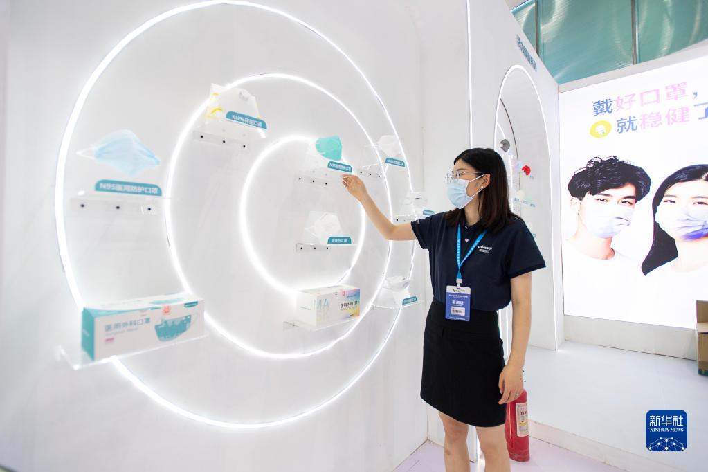 8月5日,在2022年世界大健康博覽會穩健醫療展廳,工作人員向觀眾展示口罩產品。