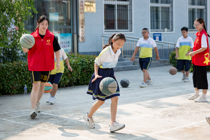 8月2日,河南省安陽市安陽縣韓陵鎮新時代文明實踐所,韓陵鎮東梁貢小學四年級學生在文藝志愿者的指導下進行籃球訓練。新華網發(王建安 攝)
