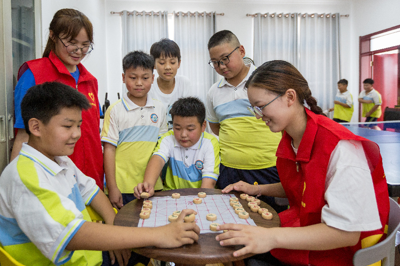 8月2日,河南省安陽市安陽縣韓陵鎮新時代文明實踐所,韓陵鎮東梁貢小學四年級學生王立恒(左一)與文藝志愿者進行中國象棋比賽。新華網發(王建安 攝)