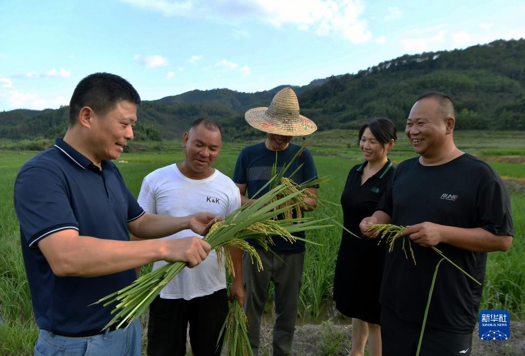 在福建南平市延平區(qū)南山鎮(zhèn),科技特派員陳鐘佃(左一)向當(dāng)?shù)剞r(nóng)民講解水稻種植相關(guān)技術(shù)(8月3日攝)。