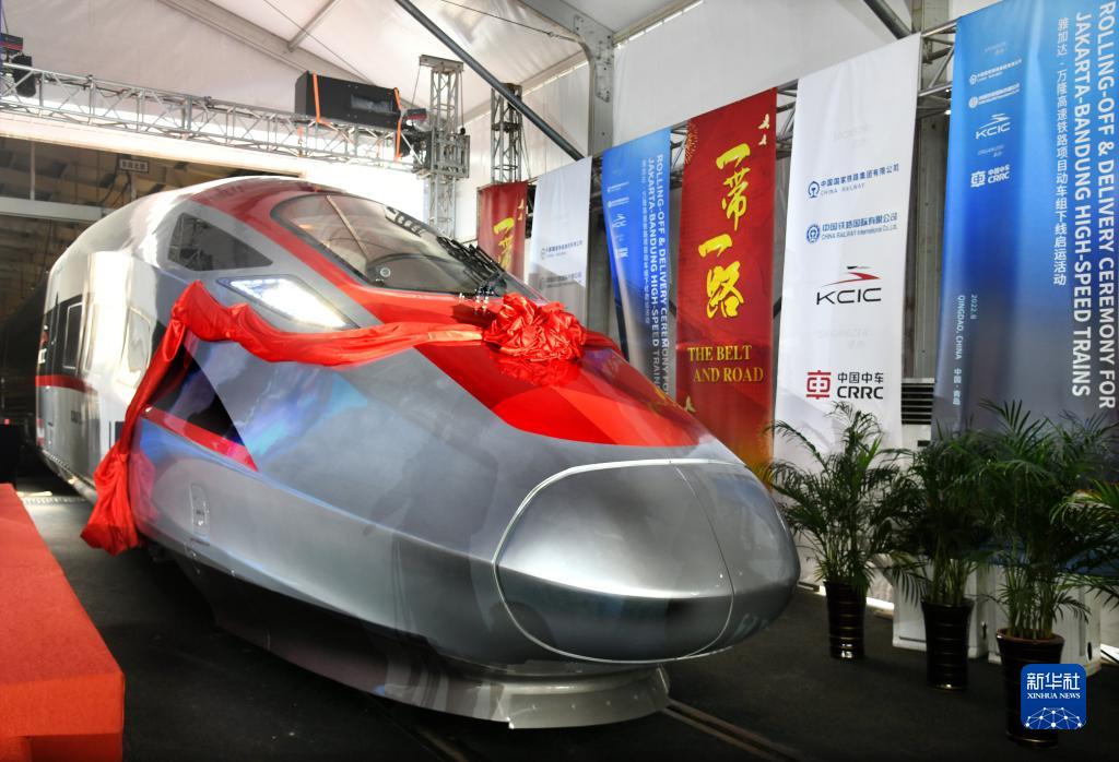 8月5日,在位于山東省青島市的中車四方股份公司,一列雅萬高鐵高速動車組亮相動車組下線啟運(yùn)儀式現(xiàn)場。