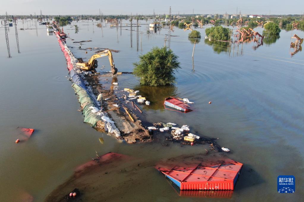 8月5日,搶險人員在潰口處進(jìn)行作業(yè)(無人機(jī)照片)。新華社記者 潘昱龍 攝