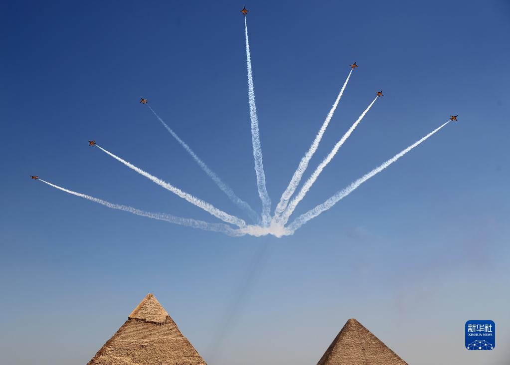當(dāng)日,埃及2022金字塔航空表演在吉薩金字塔景區(qū)舉行,來自埃及和韓國(guó)的多個(gè)飛行表演隊(duì)伍進(jìn)行了多項(xiàng)精彩的飛行表演。