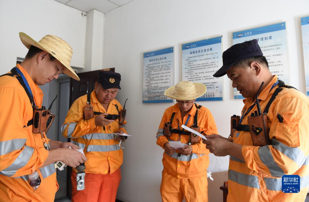 8月5日,合肥火車站運轉(zhuǎn)車間調(diào)車長李健(右一)和班組成員共同確認調(diào)車作業(yè)計劃。