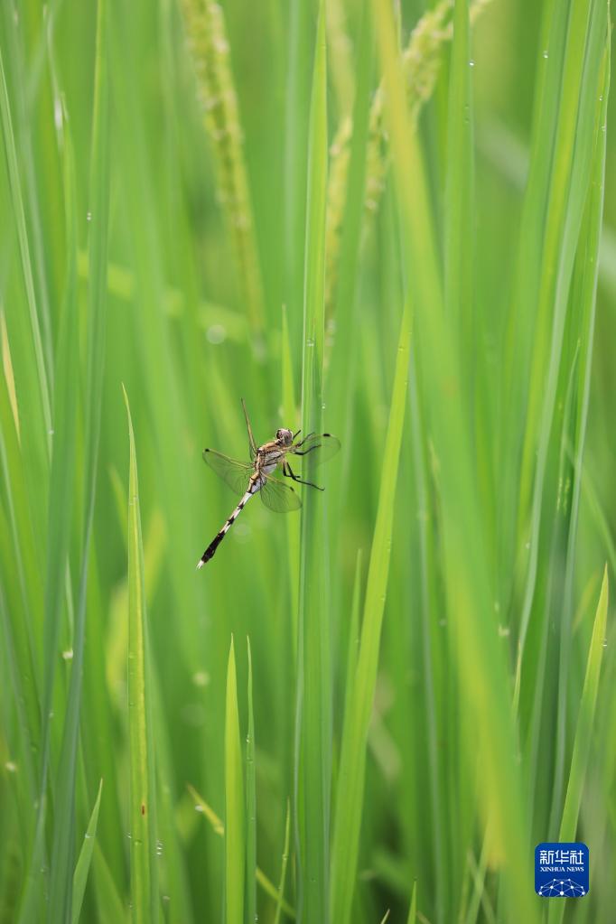 7月31日,在貴州省銅仁市江口縣,一只蜻蜓停留在稻田里。